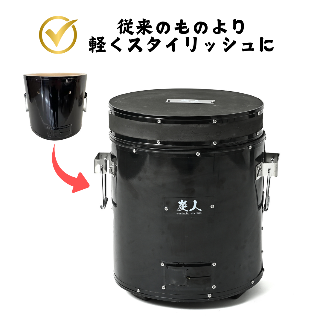 ■火起こしの方法 1)火種コンロの底にロストルを置きます。 2)火種の用意 業務用火起し器(ガス火で着火)などを使って、火種を作ります。 火種はよく着火したものをできるだけ用意する方が、火種の時間が早くなります。空気口を全開にして、火種をロストルの上に置きます。 4)木炭の投入~ふた置き 木炭を投入して、ふたを少し隙間に置いて置きます。木炭は空気が通りやすいように入れてください。